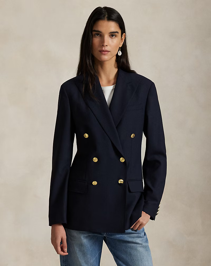 A classic wardrobe staple, this menswear-inspired blazer unites stretch wool faille with tailored details such as peak lapels and a double-breasted silhouette.