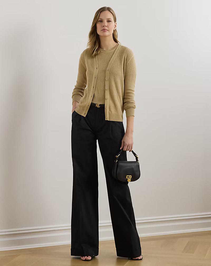 A timeless essential, these wide-leg trousers are detailed with front waist pleats, crisp creases and folded cuffs for a tailored look. This style is crafted from soft, lightweight cotton twill and has a signature horn-effect buttoned closure for a sophisticated finish.