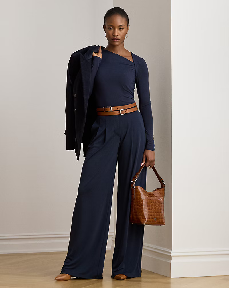 Punctuated by crisp pleats, these trousers combine a stretch jersey fabrication with a wide-leg silhouette for a fluid drape.